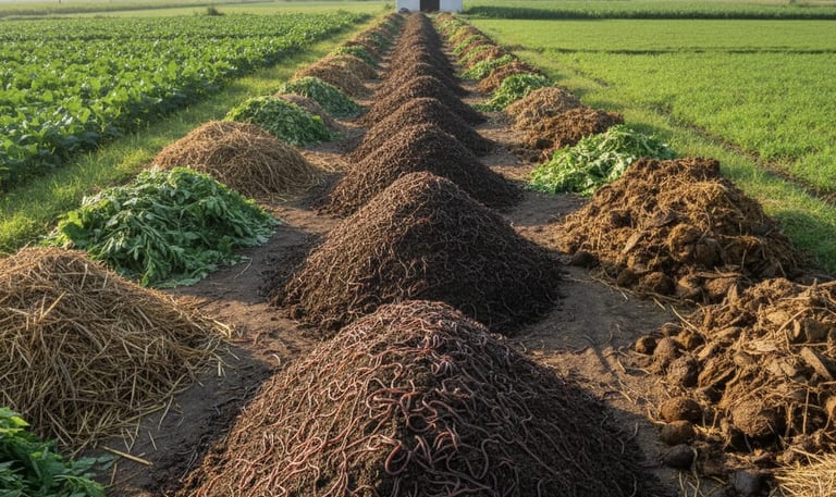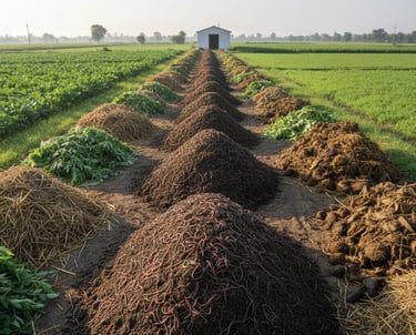 Organic waste converted into nutrient-rich vermicompost through controlled and sustainable methods.
